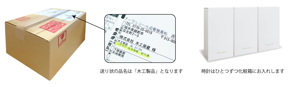 木の暮らしからお送りする商品は、シンプルなお箱で、送り状の品名を「木工製品」と書いてお送りしますので、ご安心ください。