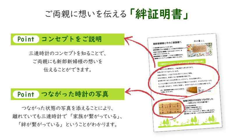 三連時計のコンセプトや3つの時計の写真をおさめた「絆証明書」もおつけします。